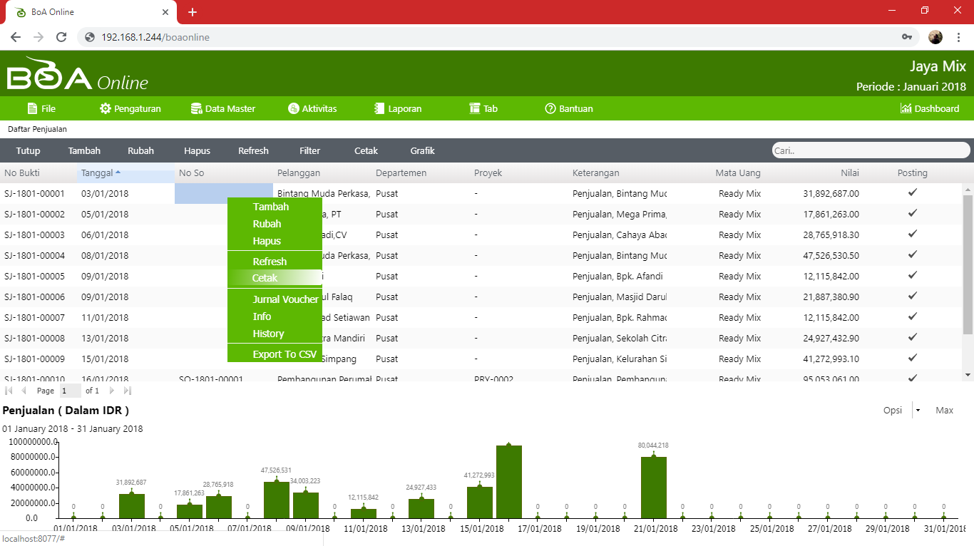 Klik menu Aktivitas > Penjualan > Daftar Penjualan > Pilih salah satu transaksi yang akan dicetak kemudian klik kanan pilih Cetak