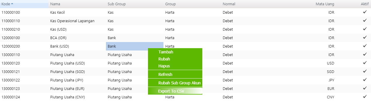 Anda dapat melakukan export data akun perkiraan kedalam format Ms. Excel dengan cara, klik menu Data Master > Data Akun > Klik Kanan > Export to CSV.