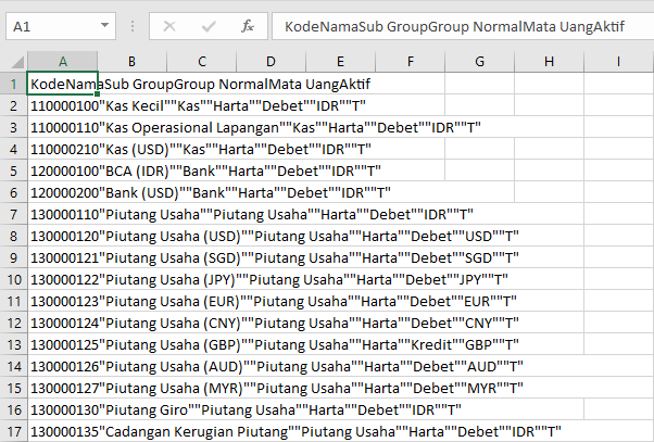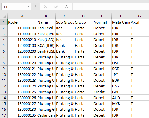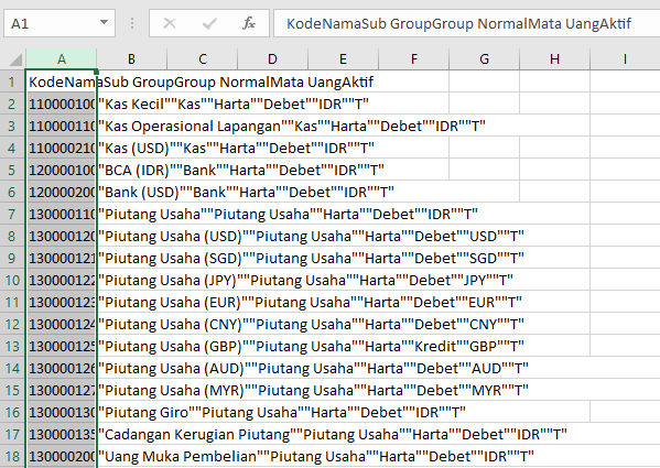 Hasil export csv akan menampilkan kode akun perkiraan seperti pada gambar berikut :