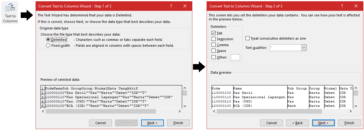 Kemudian klik menu Data yang ada di Toolbar bagian atas. Klik tombol Text to Colomns > Delimited > Klik tombol Next > Cheklist opsi Tab > Klik tombol Finish