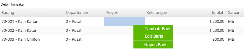 Untuk merubah atau menghapus salah satu baris barang pada detail transaksi, klik kanan kemudian pilih Edit Baris atau Hapus Baris seperti pada gambar dibawah ini :