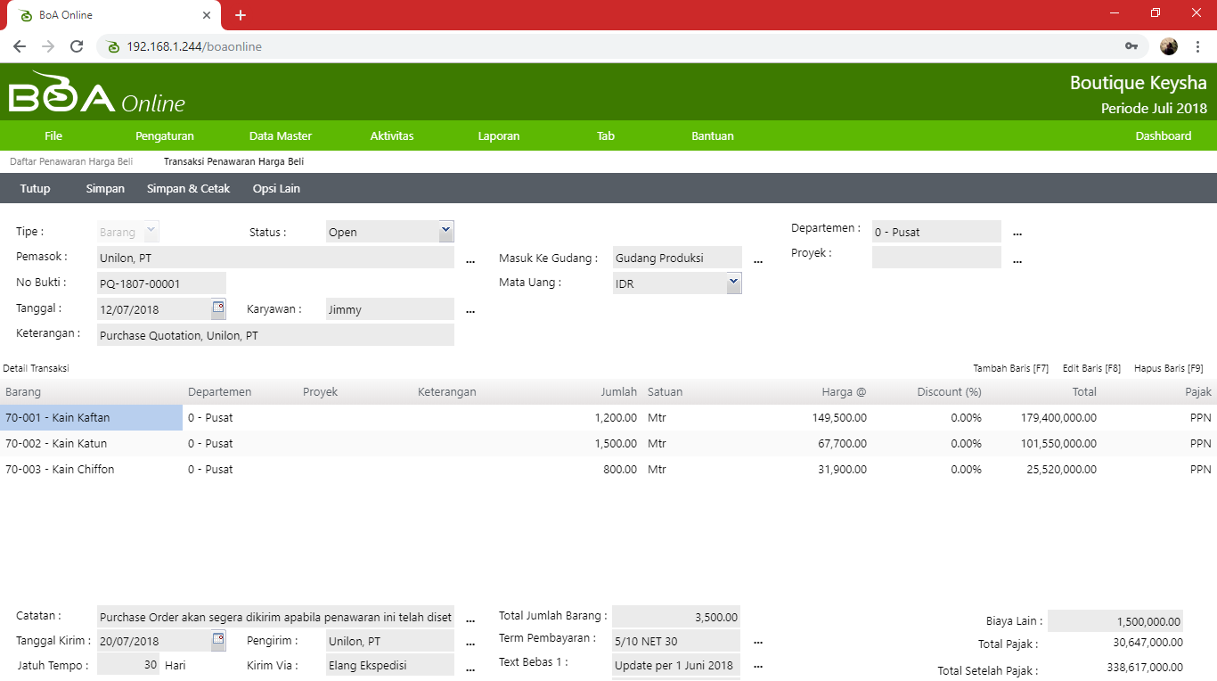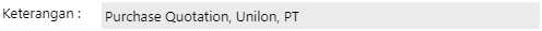 Fasilitas ini digunakan untuk mencatat dokumen penawaran harga barang yang diterima dari pemasok. Sehingga Anda dapat mencetak dan mendokumentasikan surat penawaran harga yang dikirimkan oleh pemasok. Surat penawaran harga yang sudah dibuat dapat dijadikan acuan pencatatan transaksi purchase order, sehingga Anda tidak perlu melakukan input ulang detail transaksi kedalam purchase order, cukup mengambil data dari surat penawaran harga yang sebelumnya sudah pernah dibuat. Dengan adanya fasilitas ini Anda dapat melihat laporan surat penawaran harga yang pernah dibuat.