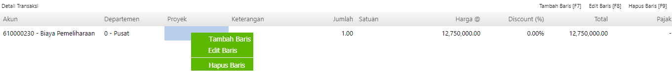 Untuk merubah atau menghapus salah satu baris akun perkiraan pada detail transaksi, klik kanan kemudian pilih Edit Baris atau Hapus Baris seperti pada gambar dibawah ini :