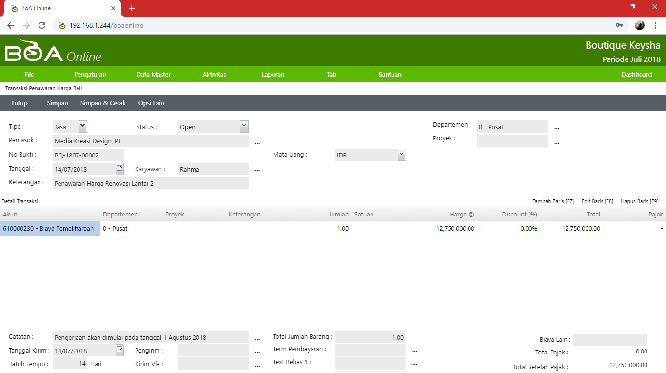 Fasilitas ini digunakan untuk mencatat dokumen penawaran harga jasa yang akan diterima dari pemasok. Sehingga Anda dapat mencetak dan mendokumentasikan surat penawaran harga yang dikirimkan oleh pemasok. Surat penawaran harga yang sudah dibuat dapat dijadikan acuan pencatatan transaksi purchase order, sehingga Anda tidak perlu melakukan input ulang detail transaksi kedalam purchase order, cukup mengambil data dari surat penawaran harga yang sebelumnya sudah pernah dibuat. Dengan adanya fasilitas ini Anda dapat melihat laporan surat penawaran harga yang pernah dibuat.