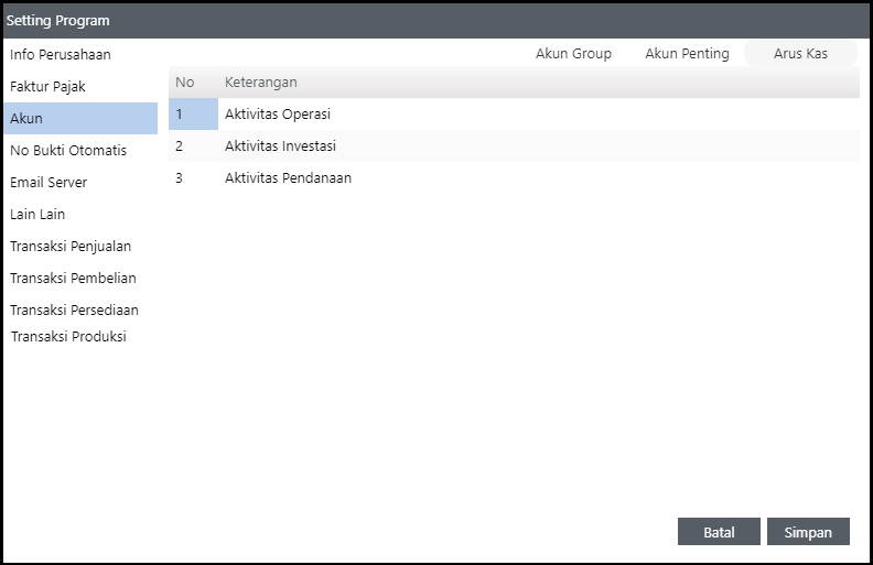 Klik menu Pengaturan > Program > Akun > Arus Kas