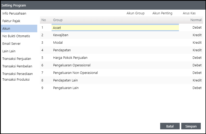 Sementara kolom Normal adalah penentuan Saldo Normal dari Akun Group tersebut yang dapat Anda rubah sesuai dengan ketentuan yang berlaku.