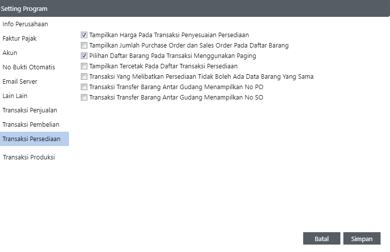 Klik menu Pengaturan > Program > Transaksi Persediaan