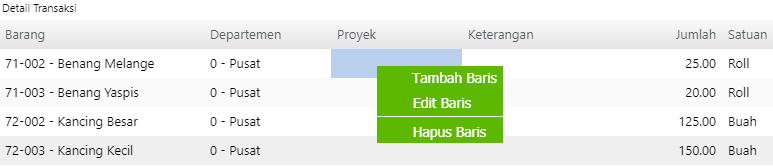 Untuk merubah atau menghapus salah satu baris barang pada detail transaksi, klik kanan kemudian pilih Edit Baris atau Hapus Baris seperti pada gambar dibawah ini :