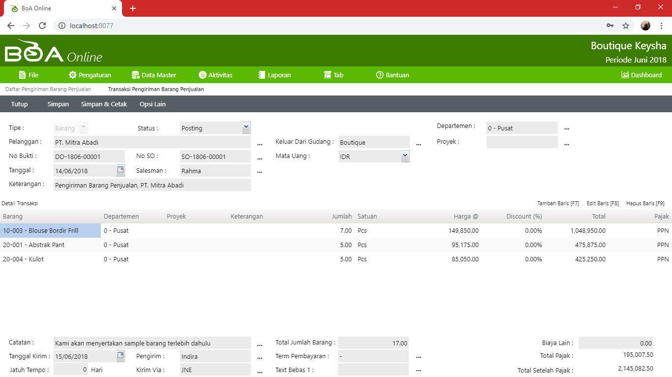 Tentukan/pilih Status pengiriman barang menjadi Posting untuk membentuk jurnal persediaan dan mengurangi jumlah stok barang di gudang.