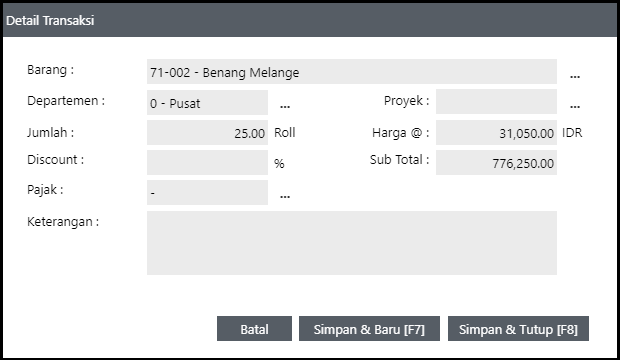 Tentukan/pilih Departemen dan Proyek jika digunakan.