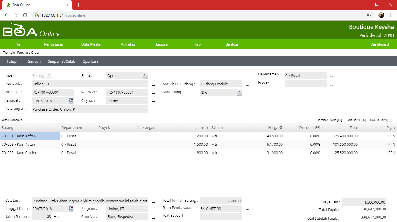 Fasilitas ini digunakan untuk mencatat setiap order pembelian atas barang atau jasa kepada pemasok, sehingga Anda dapat mendokumentasikan setiap order pembelian yang telah dikirimkan kepada pemasok. Purchase order dapat dibuat tanpa melalui proses penawaran harga beli terlebih dahulu. Dengan adanya fasilitas ini Anda dapat melihat laporan purchase order yang pernah dibuat.