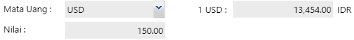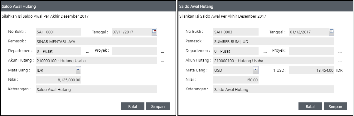 Untuk saldo awal hutang dalam bentuk mata uang asing, Anda diharuskan mengisi saldo awal hutang tersebut dengan nilai yang sebenarnya. Isi nilai kurs dan nilai saldo awal hutang dalam mata uang tersebut seperti pada contoh gambar diatas.