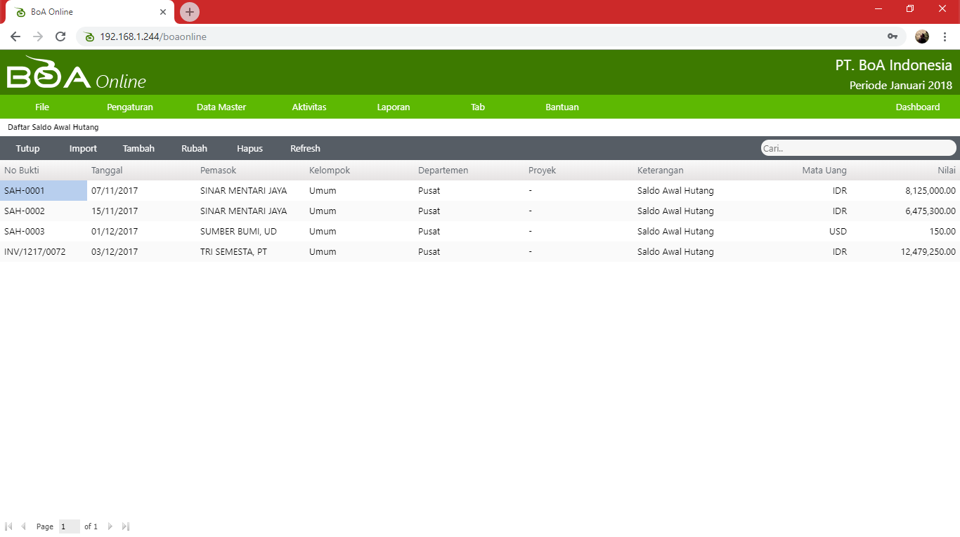 Pencarian data saldo awal hutang. Ketik nomor bukti atau nama pemasok kemudian tekan Enter