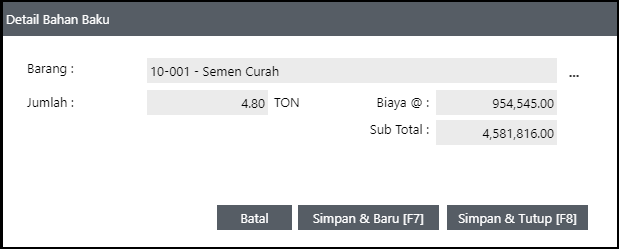 Tombol Tambah Baris untuk memasukkan detail transaksi. Tentukan nama Barang bahan baku dan Jumlah yang akan digunakan.