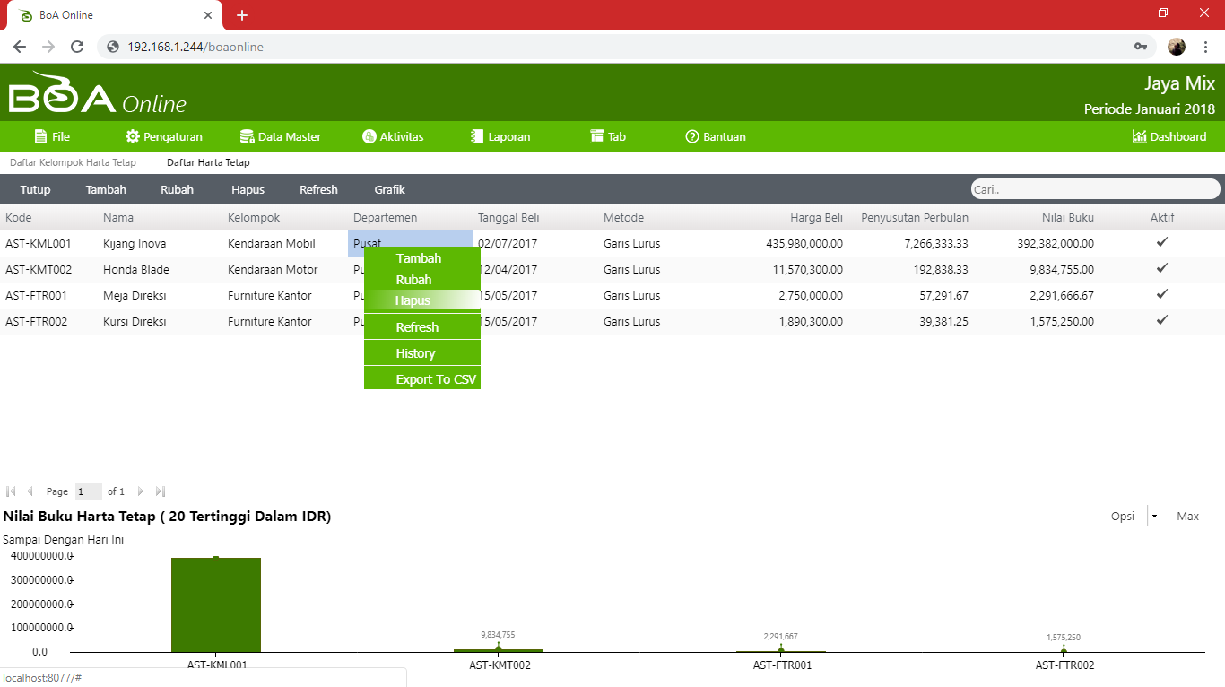 Klik menu Data Master > Data Harta Tetap > Cari Data Harta Tetap Yang Akan Dihapus > Klik Kanan kemudian pilih History seperti pada gambar berikut :