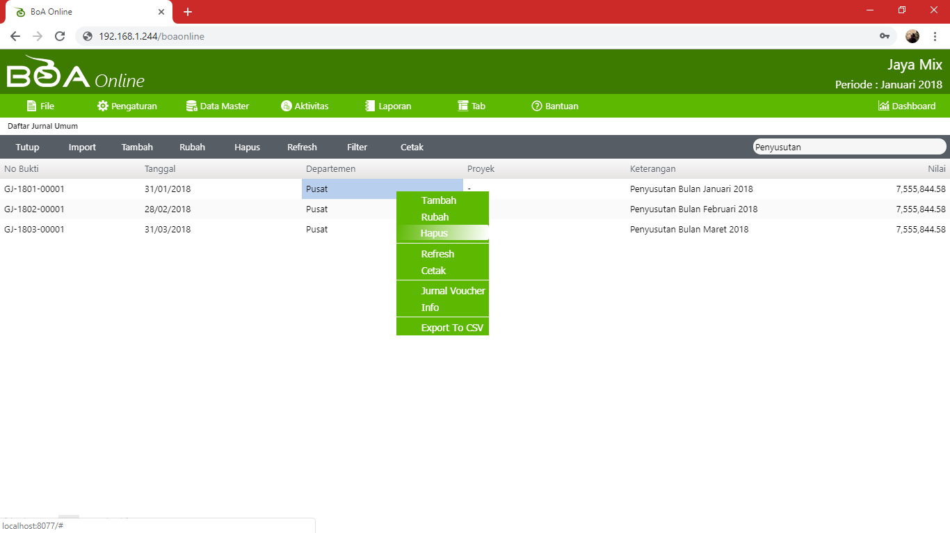 Sementara penyusutan per bulan harus dihapus satu per satu secara manual melalui menu Aktivitas > Akuntansi > Daftar Jurnal Umum.