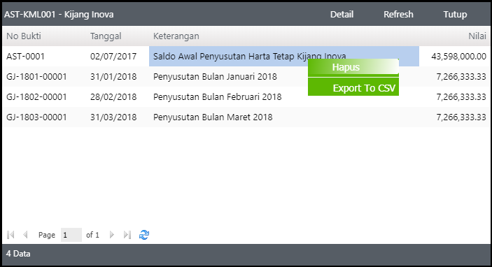 Pada kolom Saldo Awal Penyusutan, klik kanan kemudian pilih Hapus untuk menghapus transaksinya.