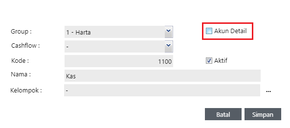 Hilangkan/uncheck opsi Akun Detail. Jika opsi Akun Detail ini ter-checklist, artinya Anda sedang membuat kode dan nama akun perkiraan (bukan Sub Group Akun)