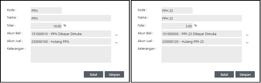 - Akun Beli : Jika kolom pajak di jendela transaksi pembelian terisi dengan PPN, maka program secara otomatis akan menjurnal PPN Dibayar Dimuka