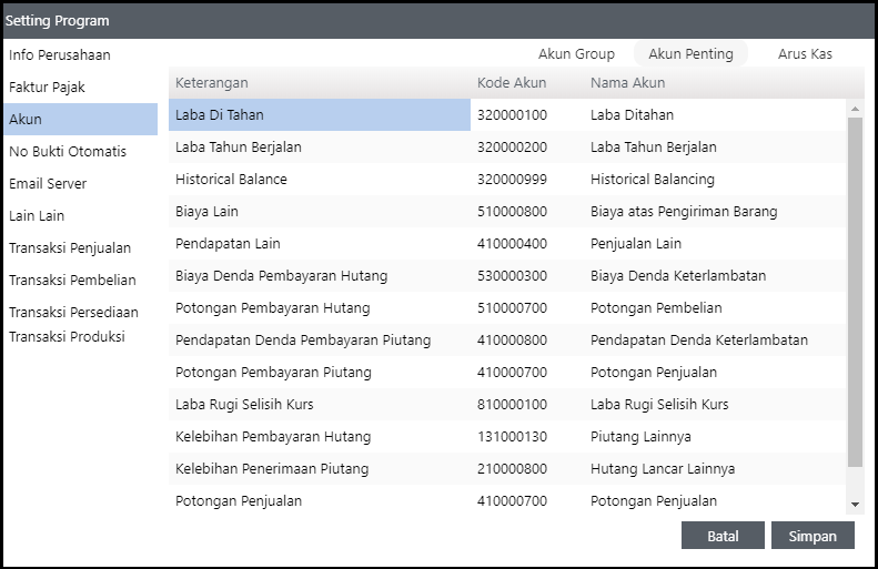 Akun penting berfungsi sebagai pembentukan jurnal otomatis pada saat menyimpan transaksi. Dibeberapa jendela input transaksi Anda tidak perlu merubah kode-kode akun sebagai pembentuk jurnal jika sebelumnya pengaturan ini telah dilakukan.