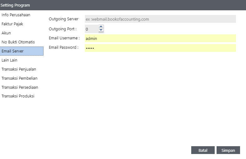 Jendela ini berfungsi sebagai penentuan alamat email yang digunakan untuk mengirim laporan-laporan yang disediakan program dalam format *.pdf