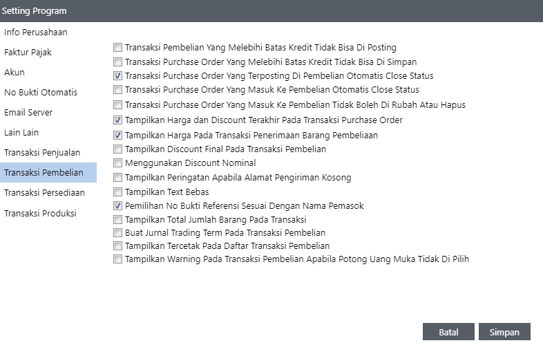 Klik menu Pengaturan > Program > Transaksi Pembelian