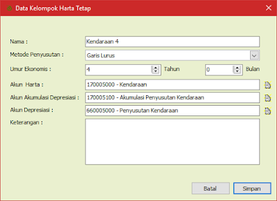 Pertama-tama, buat kelompok harta tetap untuk menentukan; nama kelompok, metode penyusutan, umur ekonomis dan penentuan control akun sebagai dasar pembuatan jurnal penyusutan otomatis. Klik menu Data Master > Kelompok Harta Tetap