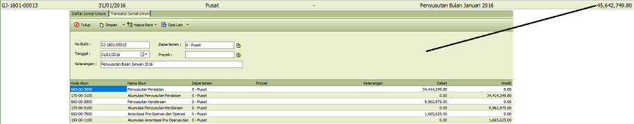 Jika seluruh data harta tetap telah diinput dengan benar, klik menu Aktivitas > Proses Penyusutan Harta tetap. Setelah itu baru melakukan tutup buku akhir bulan melalui menu Aktivitas > Akuntansi > Tutup Buku. Setelah proses tutup buku dilakukan, klik menu Aktivitas > Akuntansi > Daftar Jurnal Umum untuk melihat jurnal penyusutan seperti pada gambar berikut